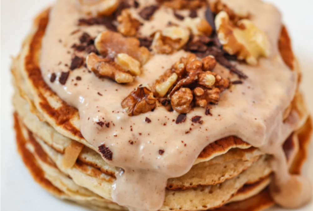 INSTRUCTIONSAdd all the pancake ingredients to a food processor or blender and process until smooth.Heat a non-stick frying pan or skillet over medium heat and spray with coconut oil. Using a ladle, spoon the pancake batter into the pan and cook until bubbles start to appear on the surface of the pancake, around 3 minutes. Flip the pancake and cook for a further 2 minutes. Repeat the process until you have used all the batter, continue to coat the pan with coconut oil spray as required. Prepare the sauce by mashing half a banana in a small bowl and combining it with the peanut butter. Add a splash of almond milk and stir together to reach the desired consistency. Pour the sauce over the pancakes and sprinkle with the cacoa and nuts.